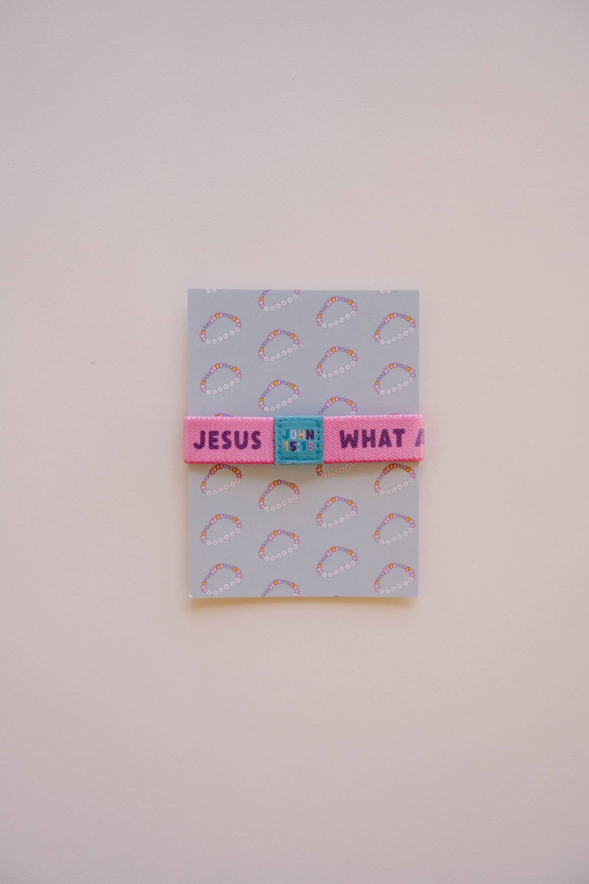 “I no longer call you slaves, because a master doesn’t confide in his slaves. Now you are my friends, since I have told you everything the Father told me.” John 15:15 Jesus is your Savior, Father, Good Shepherd, and so much more, but He is also your friend. Not only is He your friend, but He is the greatest friend you could ever ask for. He sees, knows, and loves you limitlessly. He wants to walk with you and talk with you every day and He will never leave you! Always remember that Jesus calls you friend. Details: Double-Sided Polyester Elastic Wristband Artwork printed on one side. "What a friend we have in Jesus" printed on other side. 3" before stretching. Recommended for ages three through pre-teen. Fits wrists 3"-5" Displayed on card with artwork on front and verse reference on back.