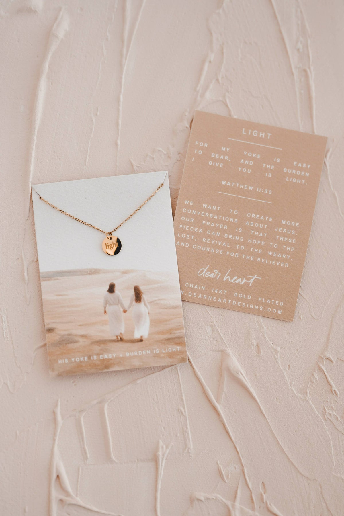 You weren’t made to carry the heavy load life puts on your shoulders alone. Exchange your heavy burdens for Jesus’ yolk which is easy and His burden that is light. He will lift the weight. Nothing is too big for Him. He gives rest to the weary, strength to the weak, and healing to the broken hearted. Take His hand. Cast your cares on Him and He will be your help. His yoke is easy + burden is light. "For my yoke is easy to bear, and the burden I give you is light." - Matthew 11:30 Details: "Light" on one side and "Matt. 11:30" on other 14kt Gold Plated Tarnish + Water Resistant Hypoallergenic 16-18" Displayed on a textured card featuring beautiful artwork by Dear Heart Designs. Full verse reference included on the back of the card.