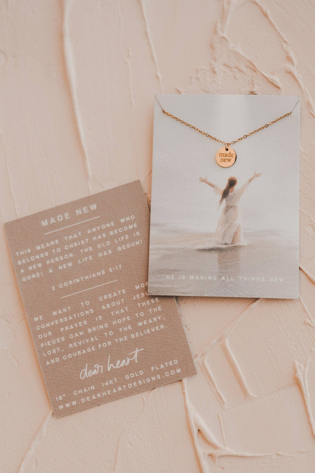 Jesus doesn’t just make you better, He makes you new. He doesn’t just fix, He transforms. When you belong to Him, you have been redeemed. You have been washed white as snow. Your sins are forgotten as far as the east is from the west. Don’t look back at the past, except to tell of what He has done. Walk in the new! He is making all things new. "This means that anyone who belongs to Christ has become a new person. The old life is gone; a new life has begun!" - 2 Corinthians 5:17 Details: "Made New" on one side and "2 Cor. 5:17" on other 14kt Gold Plated Tarnish + Water Resistant Hypoallergenic 16-18" Displayed on a textured card featuring beautiful artwork by Dear Heart Designs. Full verse reference included on the back of the card.