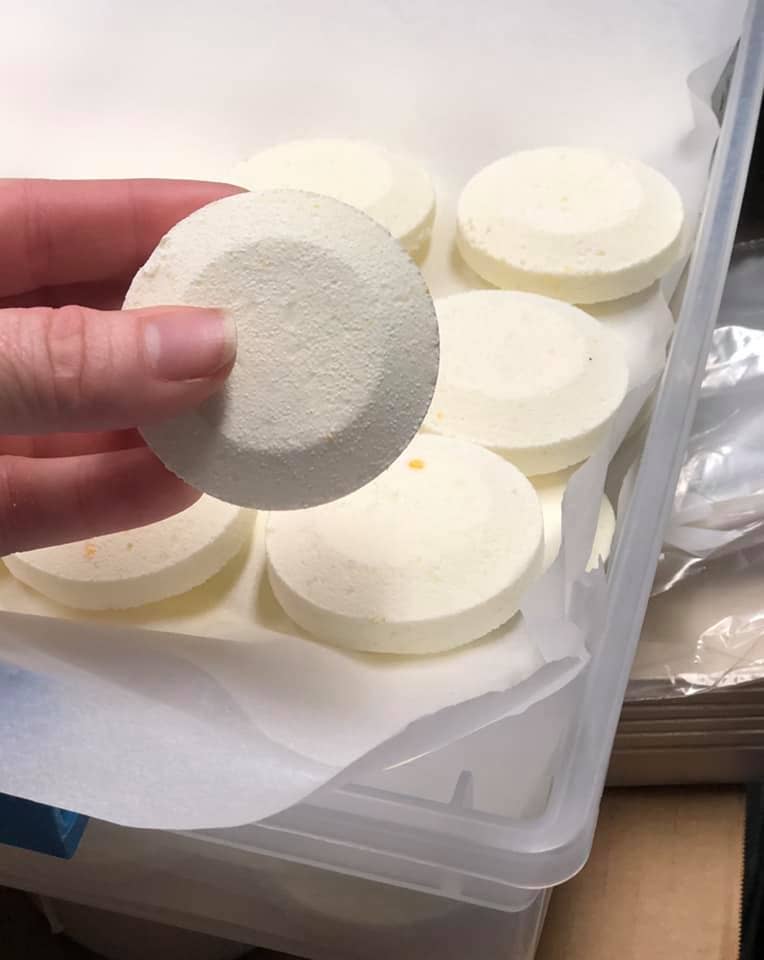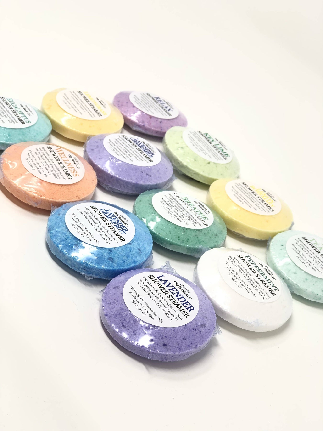 These large shower steamers are the perfect bath bomb alternative to those who don't take baths. Steamers are individually shrink wrapped. Scents: Lavender - lavender essential oil Breathe - peppermint, eucalyptus and lemon essential oils Lemon rosemary - lemon and rosemary essential oils Lavender grapefruit - lavender and grapefruit essential oils Lemongrass - lemongrass essential oil Eucalyptus - eucalyptus essential oil Peppermint - peppermint essential oil Wellness - cinnamon, eucalyptus and lemon essential oils Tea tree - tea tree essential oil Lavender chamomile - lavender and chamomile essential oils Key lime - key lime essential oil Relax - lavender and lime essential oils Directions: Place shower steamer in back corner of shower or tub ledge, and drip a few drops of water on to activate. Once the drops hit the steamer, it will activate and go up in the shower steam. Do not let steamer get hit by shower spray, or it will fall apart and go down the drain.